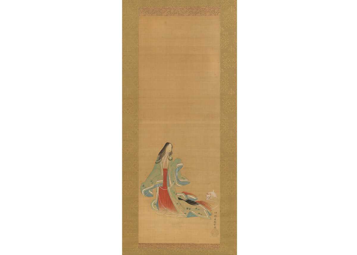 Au centre des tourbillons de la robe de cette femme se trouve un chat. Les couleurs roses translucides de la soie qu'elle porte sont particulièrement accentuées par la forte encre noire utilisée pour le dessiner. Cette gravure sur bois de Kitagawa Utamaro est une parodie érotique de la troisième princesse du Conte de Genji. Utamaro emmène le spectateur derrière le rideau, où nous pouvons voir la troisième princesse dans l'intimité et la sécurité d'être invisible, jouant et interagissant avec un chat - et pourtant nous la voyons, à travers un regard masculin, sachant très bien que c'est le regard masculin de Kashiwagi qui va bientôt perturber cette scène et sa vie telle qu'elle la connaît.