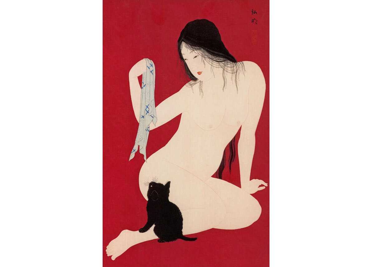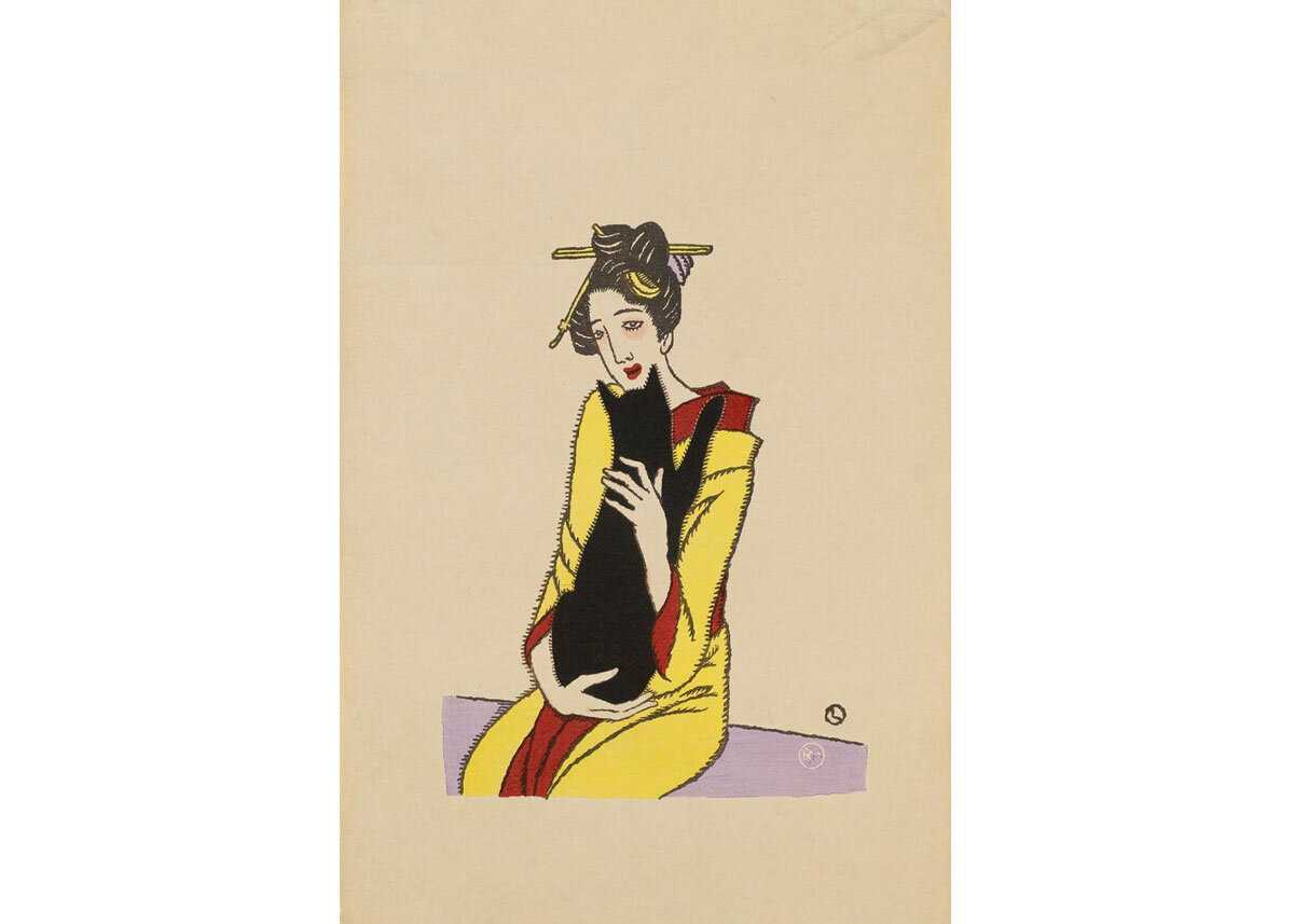 Takehisa Yumeji était connu pour ses illustrations de couvertures de livres, de journaux, de cartes postales et même de papier washi. Poète et peintre, Takehisa peignait généralement des bijinga (peintures de belles femmes) aux yeux écarquillés et dans un style quelque peu modernisé. Dans son livre The Concept of Japanese Painting , il a souligné la valeur des lignes dans l'art japonais, qu'il considérait comme une représentation linéaire des pensées et des processus les plus intimes d'un être humain. Woman Holding Black Cat est une gravure sur bois à l'encre sur papier. De nombreuses itérations et copies de cette image ont été réalisées depuis sa création en 1920.
