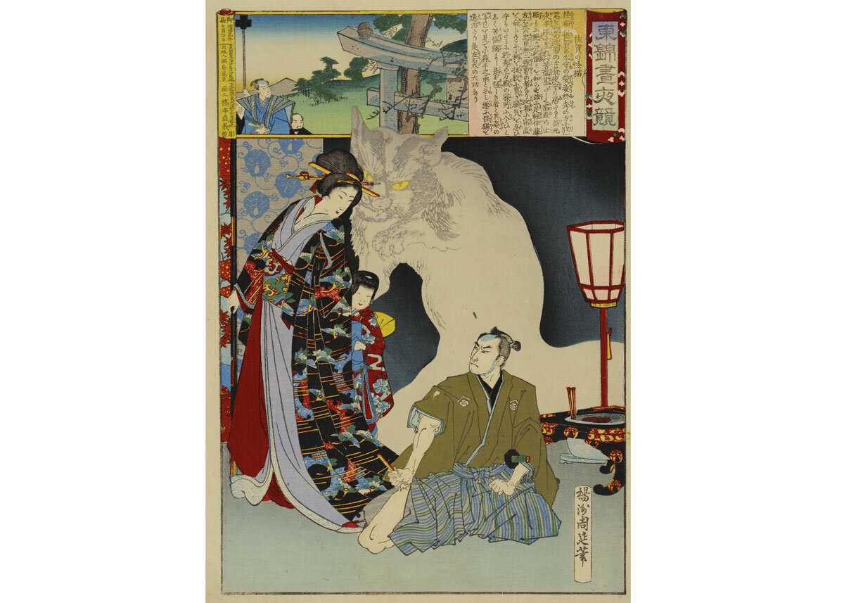 Connu comme l'un des graveurs sur bois les plus créatifs de l'ère Meiji, Yoshu Chikanobu a représenté diverses scènes et sujets dans ses œuvres. De kabuki des scènes aux bijinga (peintures de belles femmes), des champs de bataille à la mythologie japonaise, Chikanobu s'est inspiré de tout. La photo représente le monstre chat de Saga, une scène de la légende du bakeneko (chat démoniaque) qui hantait la famille Nabeshima, seigneurs féodaux de la province de Hizen, aujourd'hui connue sous le nom de préfectures de Saga et Nagasaki. La légende raconte que la maîtresse du château de Saga était possédée par l'esprit d'un chat démoniaque en quête de vengeance. Chaque nuit, le chat démoniaque consommait l'énergie du seigneur de Saga pendant son sommeil. Pour rester éveillé, le Seigneur se poignardait la cuisse avec un couteau pour ne pas succomber à la trahison du chat démoniaque. La méthode d'impression sur bois est ici délicate et pourtant extravagante dans les détails du chat et de ses victimes.