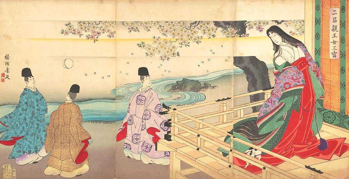 La troisième princesse et Kashiwagi illustre une scène du célèbre livre, Le conte de Genji. Dans ce chapitre, la troisième princesse est repérée par Kashiwagi derrière un store, puis tombe instantanément amoureux d'elle. Kashiwagi l'aperçoit grâce à un chaton qui attire son attention sur le store derrière lequel elle se trouvait. Dans la représentation de Chikanobu, cependant, nous sommes en mesure de voir la troisième princesse en pleine lumière. Ici, la troisième princesse interagit avec le chaton qui, s'élançant sous le store en bambou, a attiré l'œil de Kashiwagi, et a amené son regard à se poser sur elle. Le chaton, bien qu'enjoué et inconscient, est le catalyseur de l'histoire - qui finit par déboucher sur des événements violents...